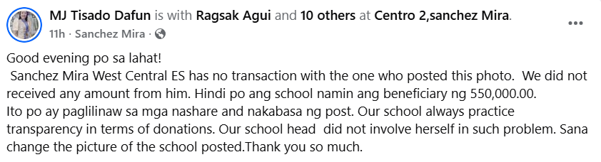 “Sanchez Mira West Central ES has no transaction with the one who posted this photo. We did not received any amount from him. Hindi po ang school namin ang beneficiary ng 550,000.00. Ito po ay paglilinaw sa mga nashare and nakabasa ng post.”